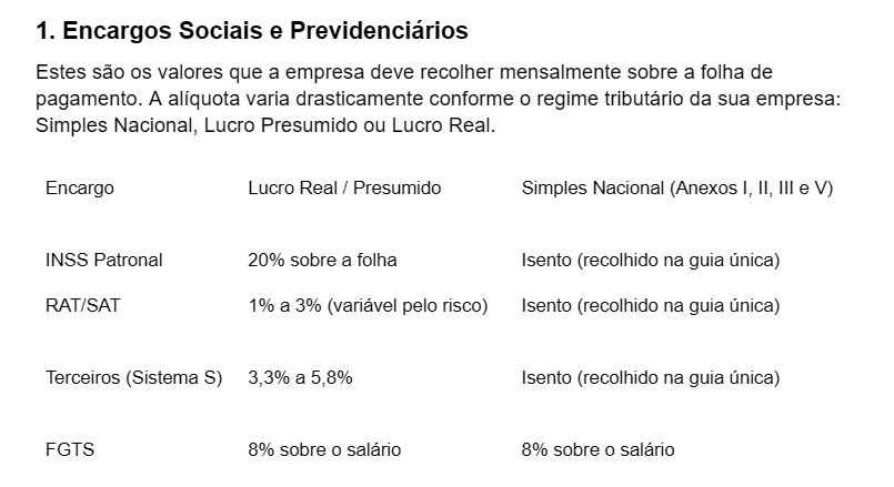 Para empresas no Lucro Real ou Presumido, a soma dos encargos sociais pode adicionar cerca de 30% a 35% ao salário bruto do funcionário, antes mesmo de considerarmos as provisões e os custos variáveis.